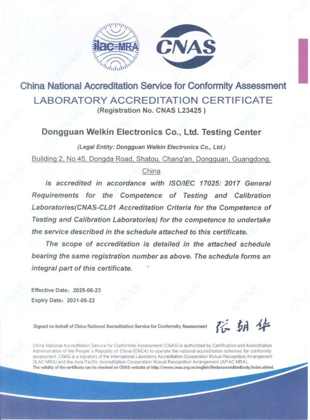興勤集團子公司—東莞為勤電子有限公司的檢測中心 (以下簡稱東莞為勤電子檢測中心),獲得實驗室管理體系CNAS認證證書 (註冊號:CNAS L23425),通過 ISO/IEC 17025:2017《檢測和校準實驗室能力的通用要求》及 CNAS-CL01《檢測和校準實驗室能力認可準則》的嚴格考核。此項成果代表東莞為勤電子檢測中心在測試能力、品質管制與人員資質方面,全面達到國際化認證最高標準的里程碑。