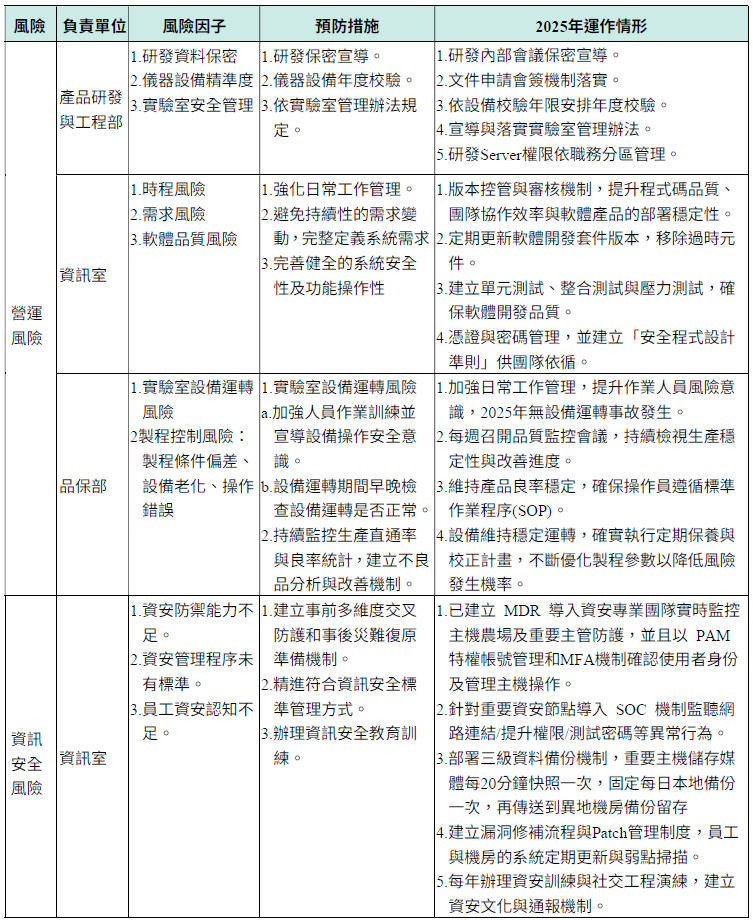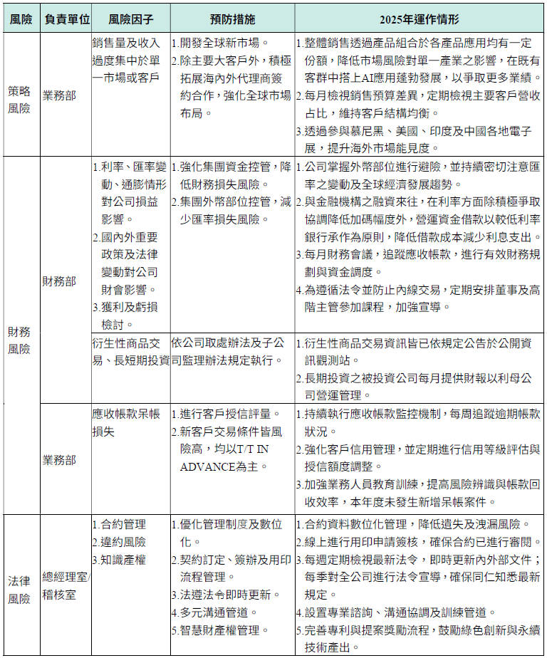 本公司積極推動落實風險管理機制,每年一次向董事會報告其運作情形,2025年執行情況已提報至2026/1/21董事會,主要運作情形如下: