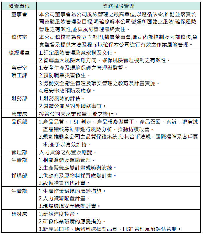 為有效執行風險管理機制,本公司由董事會、各風險管理單位公司日常事務處理之直屬最高主管、各風險管理單位及子公司共同參與推動。每年定期針對各風險管理單位的工作範圍,辨識風險、衡量風險並進行風險控制。