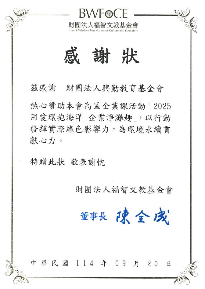 興勤教育基金會支持贊助福智文教基金會與慈心有機農業發展基金會於2021年10 月31日,配合政府防疫措施舉辦「企業行動力,我們淨灘趣」活動。此次,除了結合在地企業民間團體的力量,並偕同高雄市林園區汕尾國民小學、高雄市林園區公所、高雄市政府環保局、南海寺、左營樂齡學習中心等,於高雄市林園區汕尾月牙灣進行用愛環抱海洋的淨灘活動。當日參與淨灘的企業人士、學校師生及民眾總計 705 位,總計清出廢棄物 671 公斤。